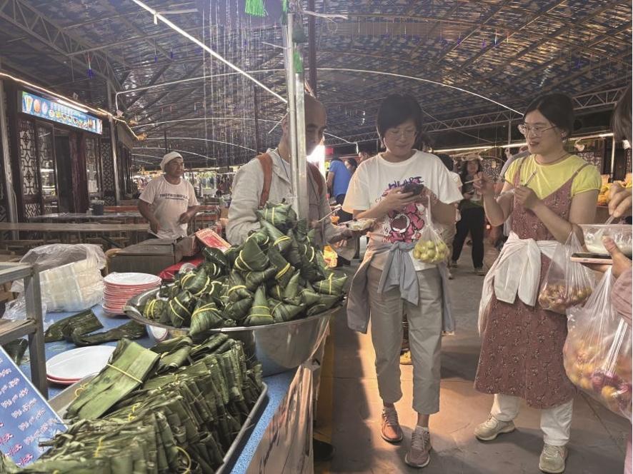 图为游客正在库车市乌恰供销大巴扎夜市购买酸奶粽子