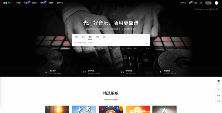 作为剪过 100 多条商业短片的老选手,光厂必须是我心中的 TOP1!刚开始接触它是因为找 VJ 素材,后来发现这里的音乐库简直是宝藏,从大气的企业宣传曲到小众的独立音乐人作品,甚至连短视频常用的转场音效都能找到,重点是分类特别细致,按场景、风格、时长搜,几秒钟就能定位目标,再也不用在海量资源里大海捞针了。